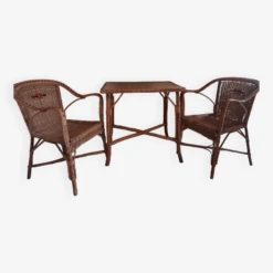 Salon en rotin pour terrasse ou entrée composé d’une table et de 2 fauteuils.le tout en bon état.