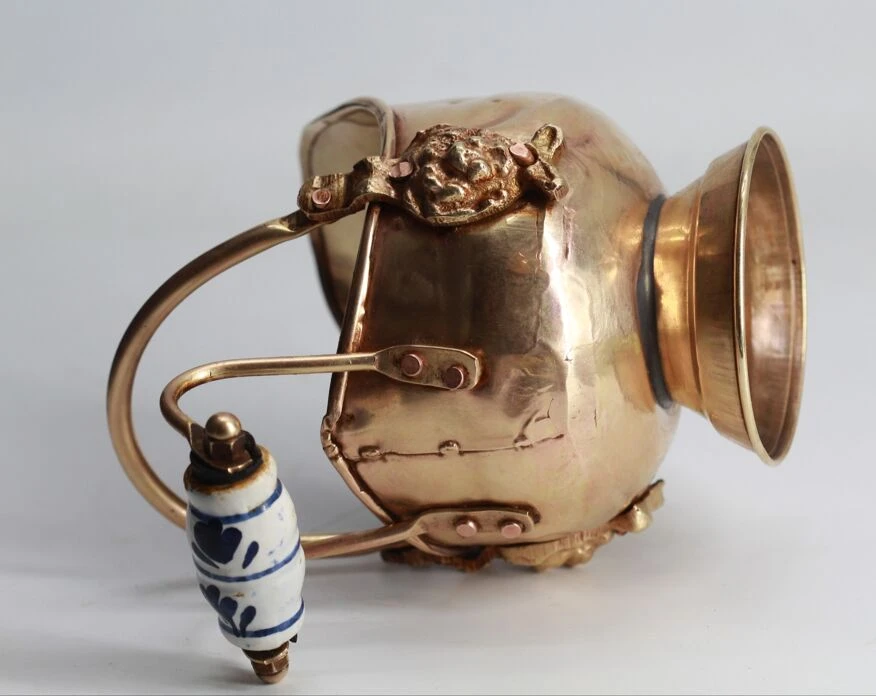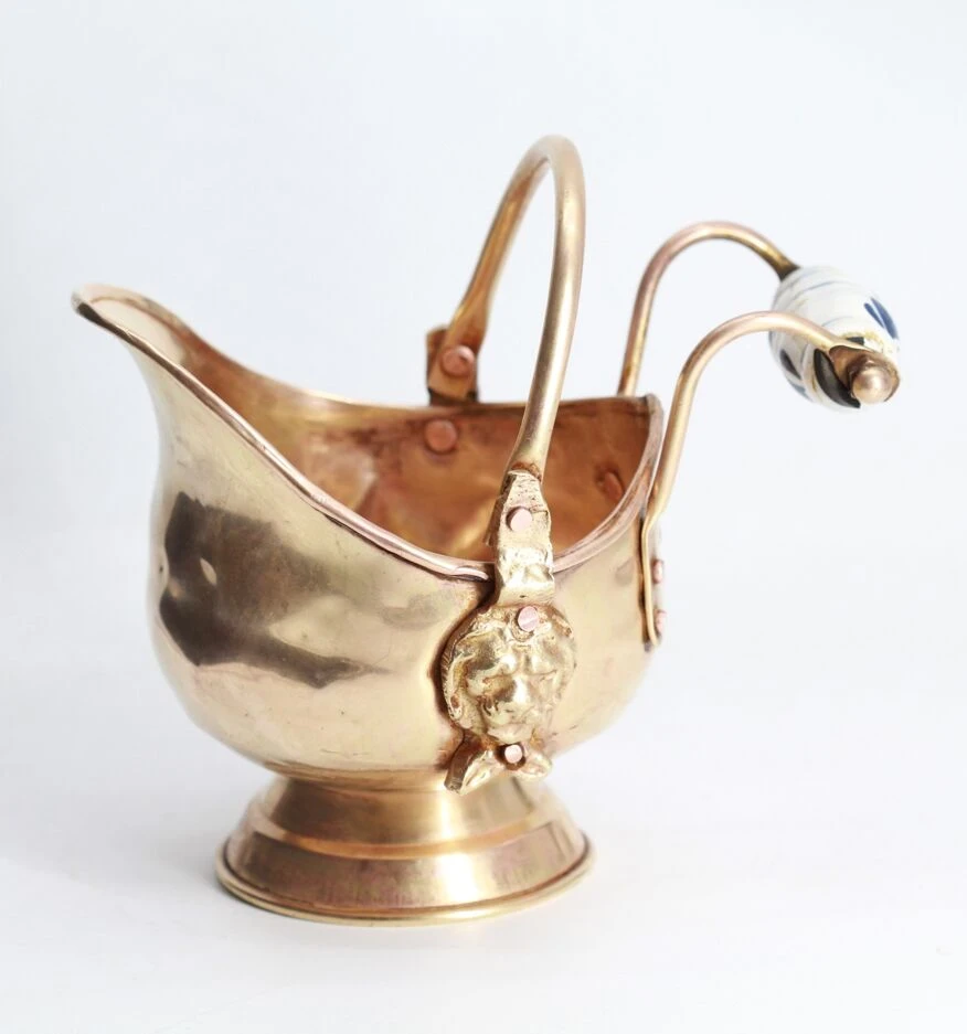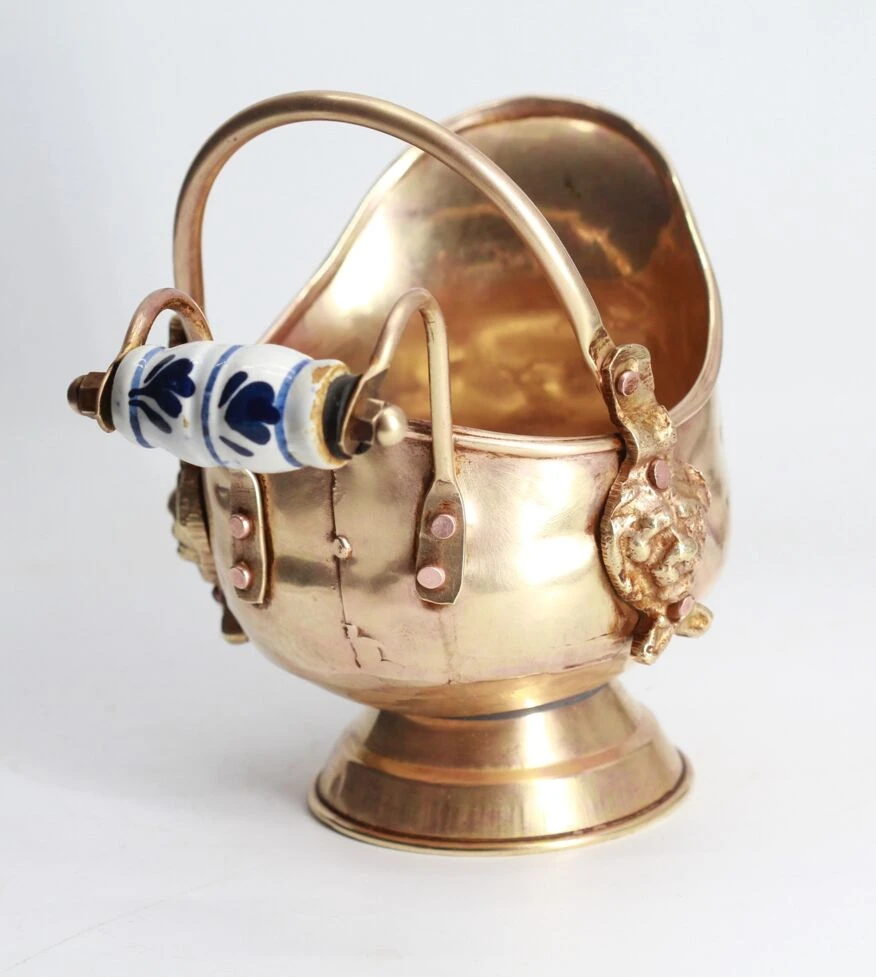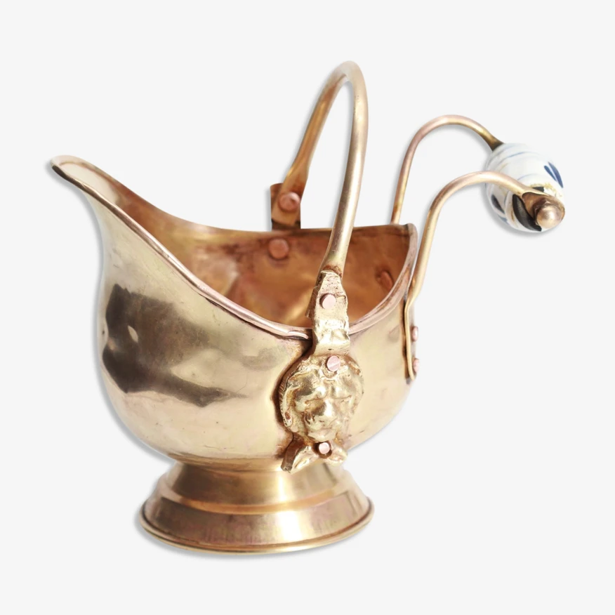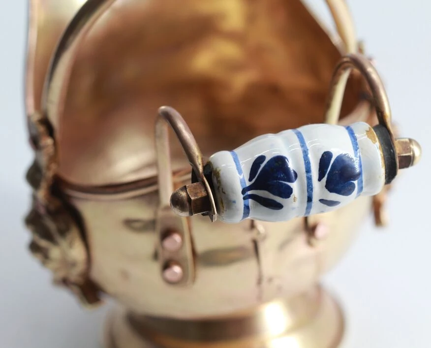 Petit seau de frêne en cuivre tête de lion et anse en céramique bleu et blanche.