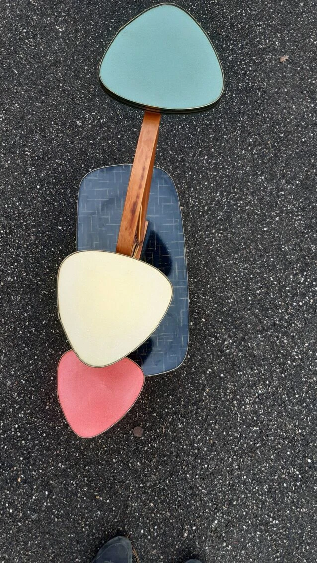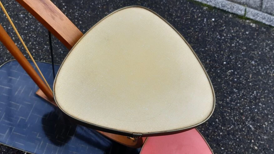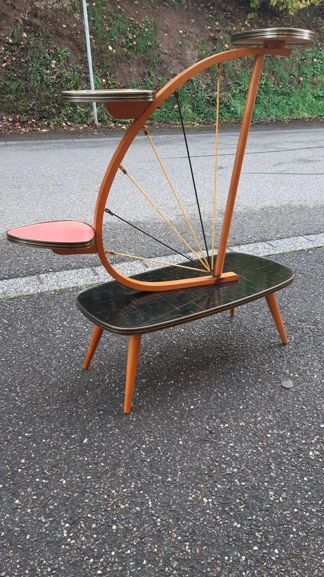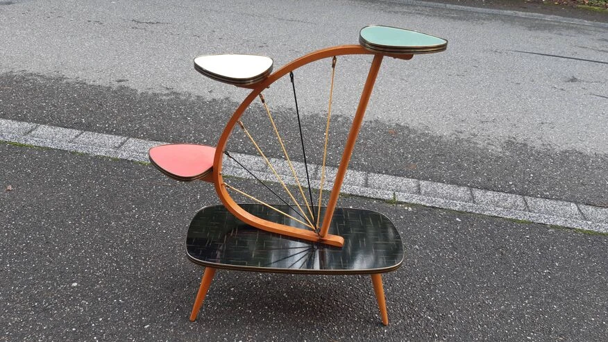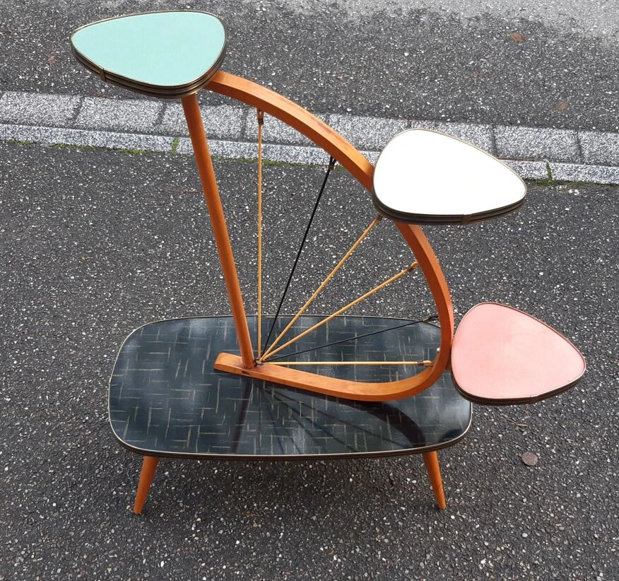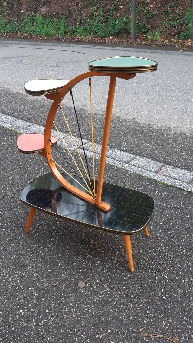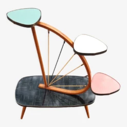 Grand stand porte plante en formica, datant du début des années 60, basé noire à motifs dorés, 4 pieds fuseaux en hêtre, 3 plateaux triangulaires rouge/rose, jaune, vert sur un arc en hêtre, cerclages en laiton, fils scoubidou.