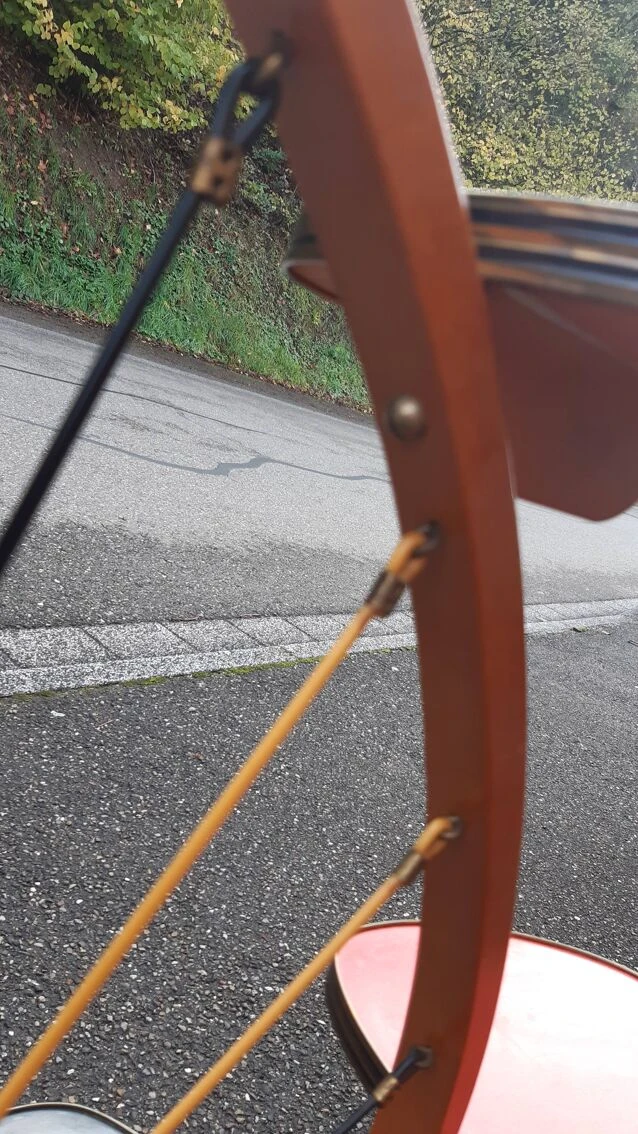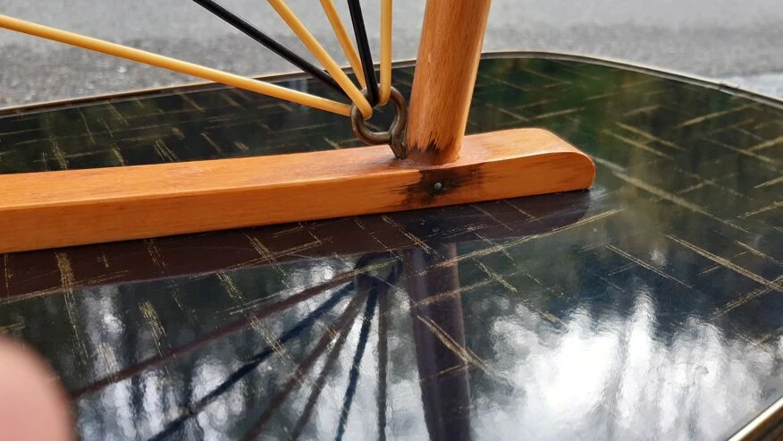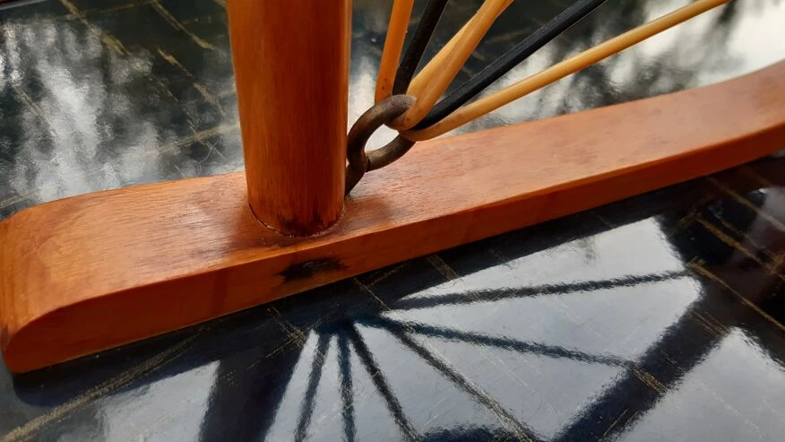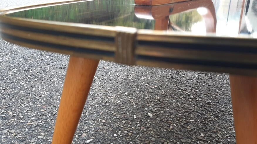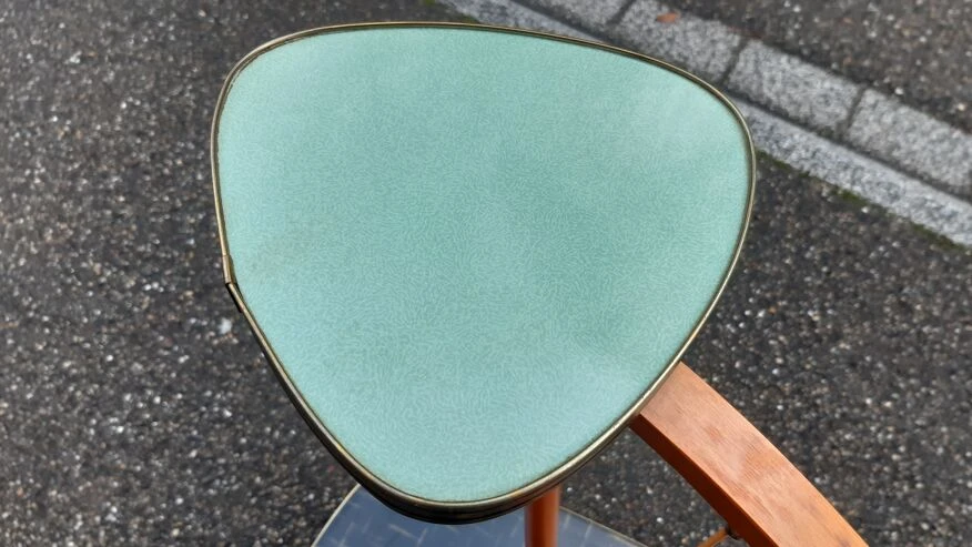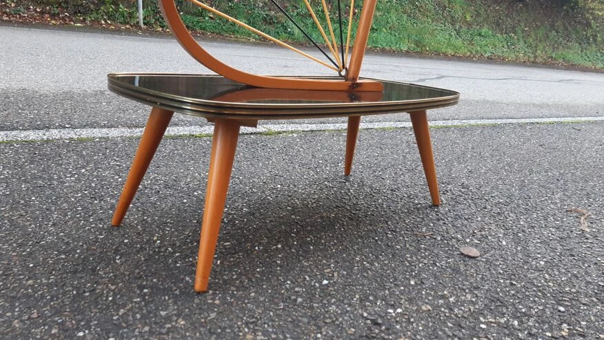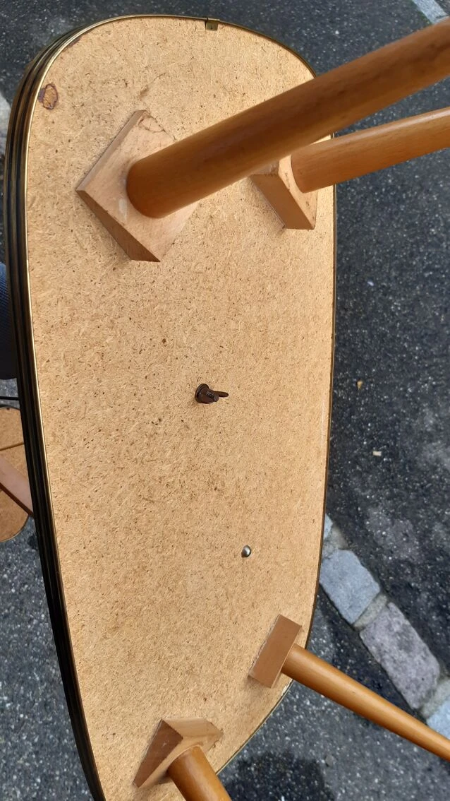 Grand stand porte plante en formica, datant du début des années 60, basé noire à motifs dorés, 4 pieds fuseaux en hêtre, 3 plateaux triangulaires rouge/rose, jaune, vert sur un arc en hêtre, cerclages en laiton, fils scoubidou.