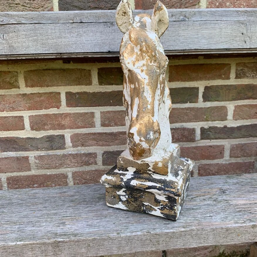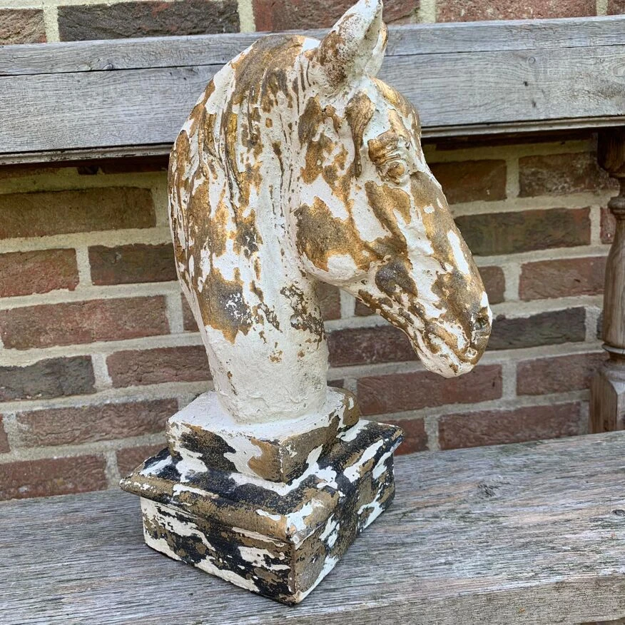 Elégante tête de cheval en plâtre peint et naturellement patiné de 35 cm de hauteur.
