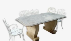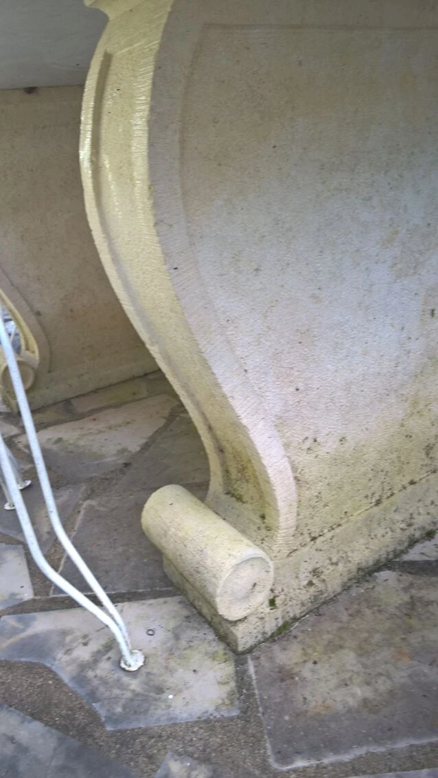 Réalisée par un artisan, en pierre dure de Saint Pierre Aigle dans la commune du même nom, près de Soissons. Présente deux jolis supports classiques, partie basse enroulée et sculptée. le plateau est à pans coupés et chanfreinés.