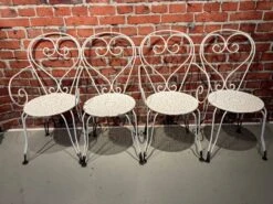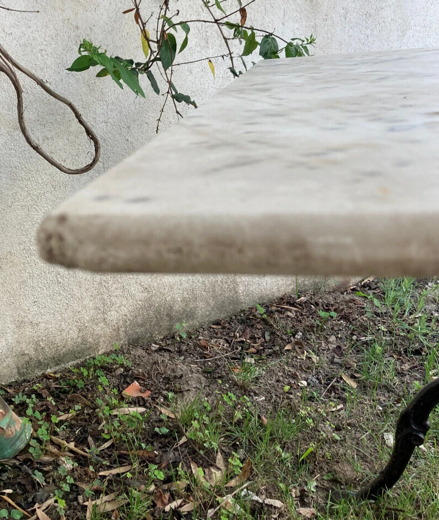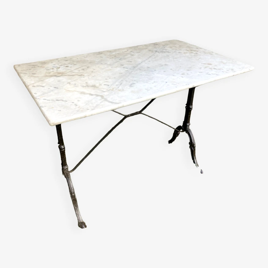 Table de jardin pied en fer forgé, dessus marbre, dans le goût du xixe, production de la deuxième moitié du xxeme, léger éclat sur un coin du marbre, 100×60 hauteur 70.
