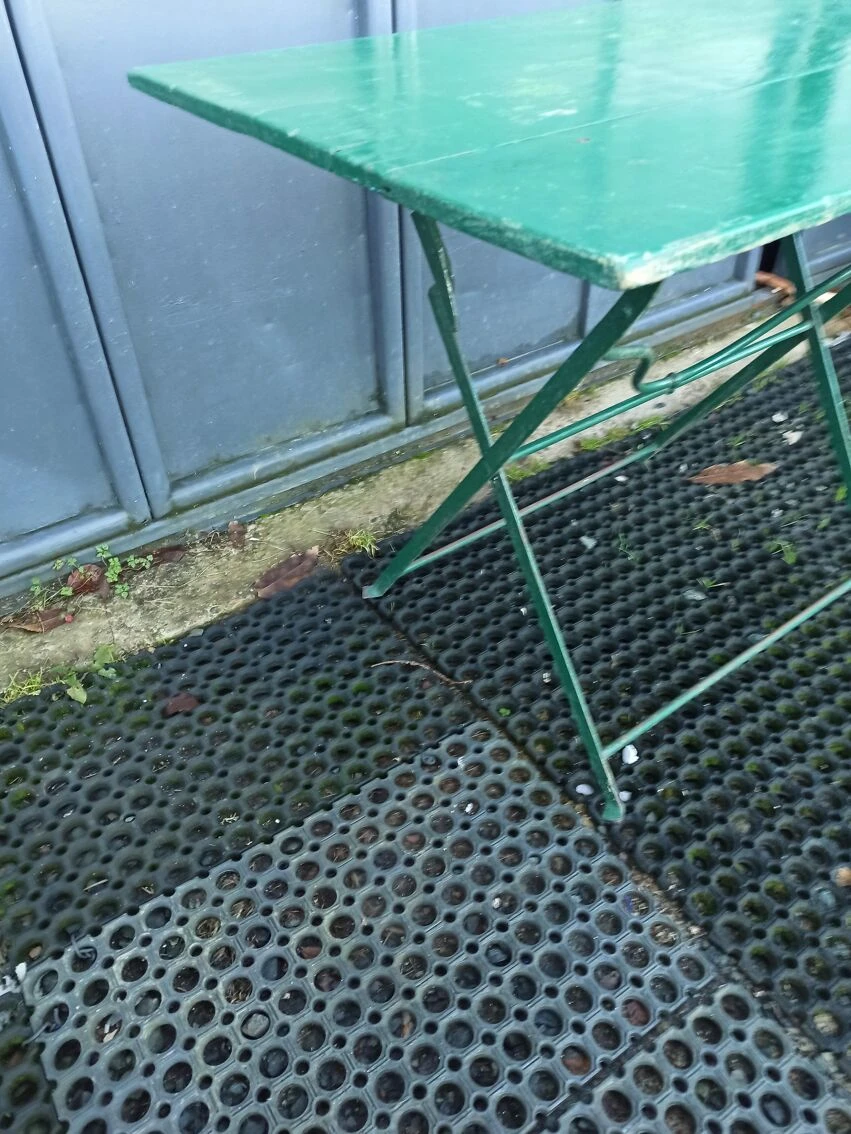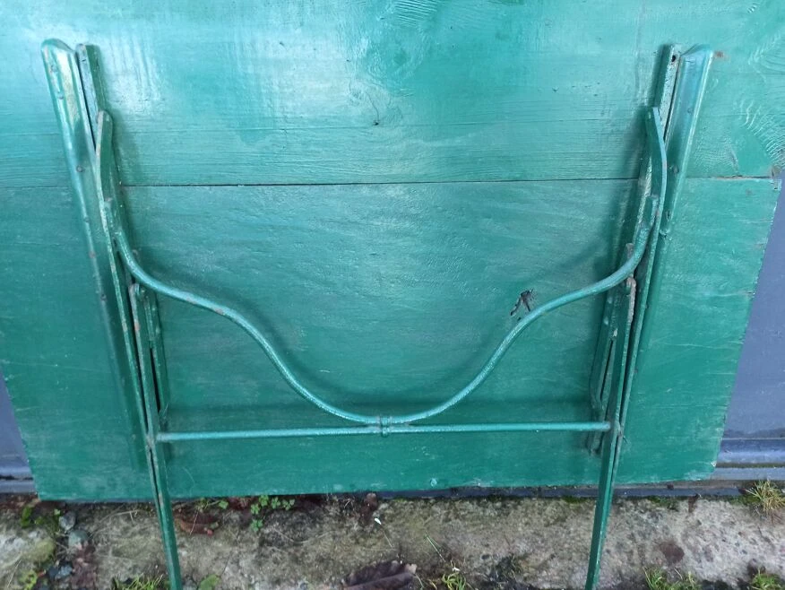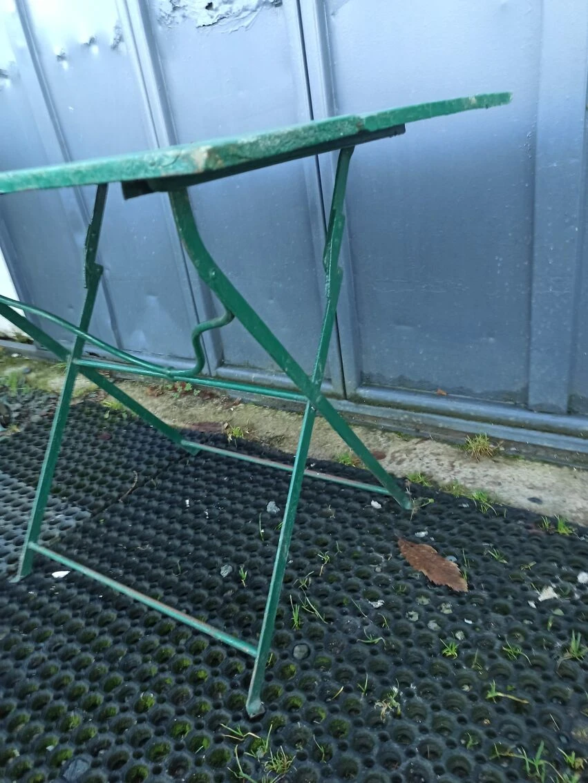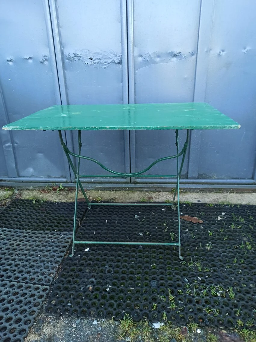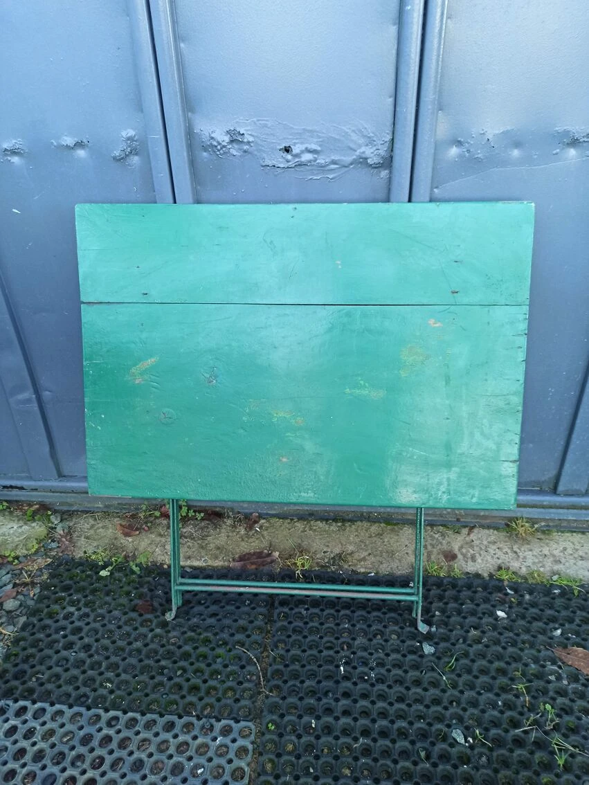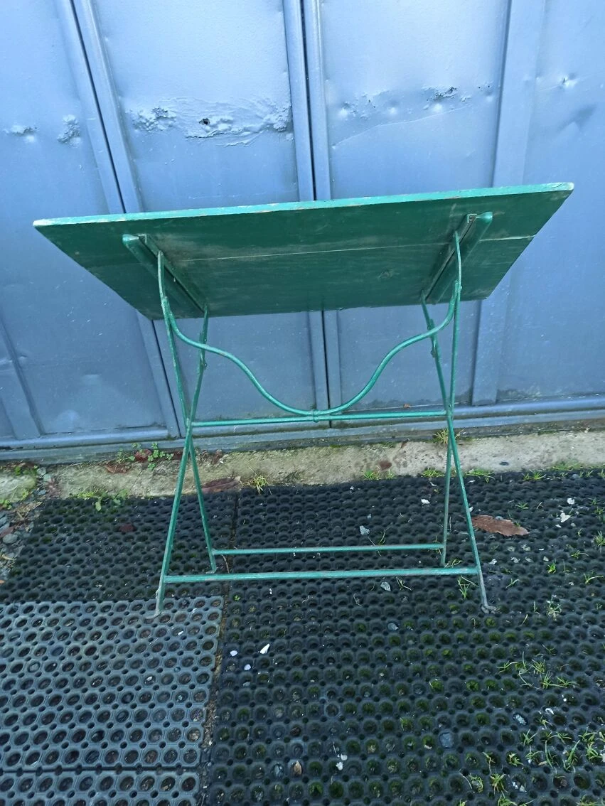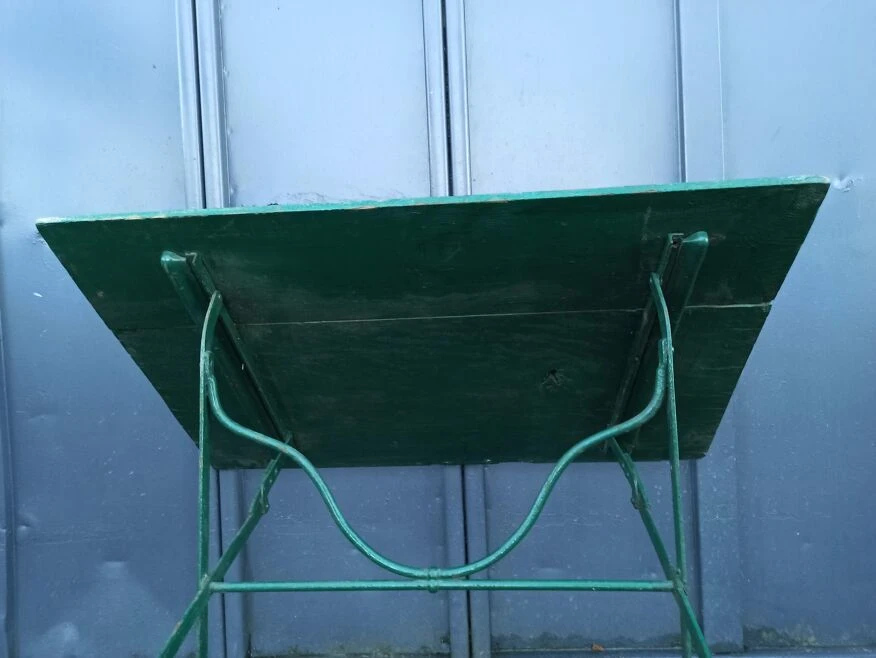 Table de jardin pliante en fer forgé et plateau en bois peint en vert.