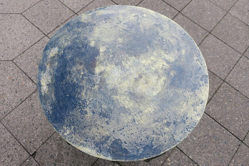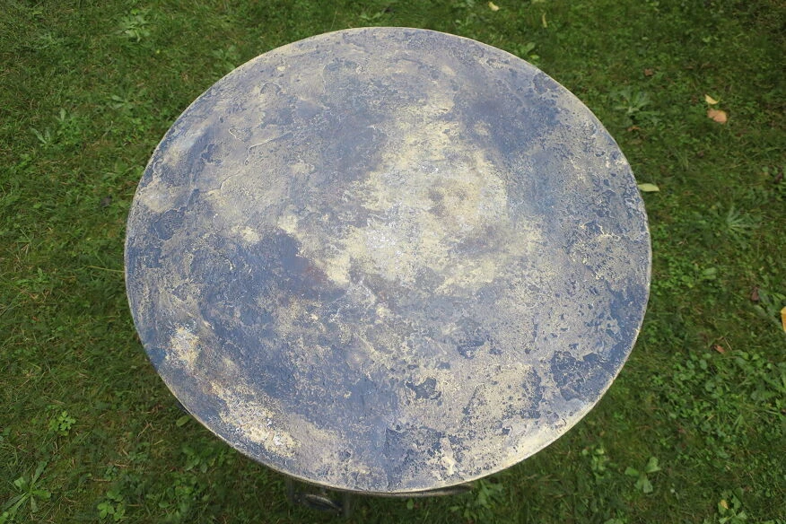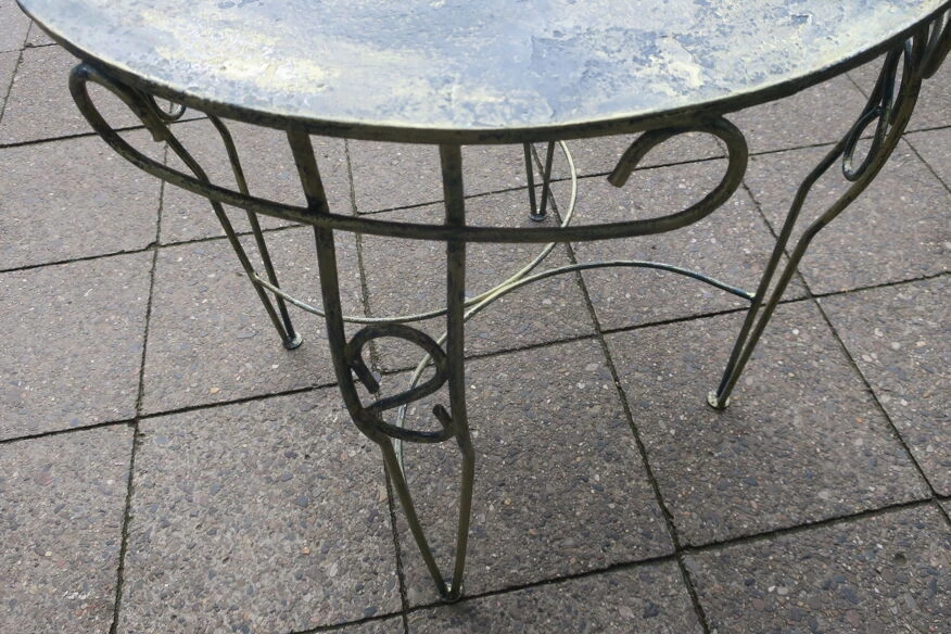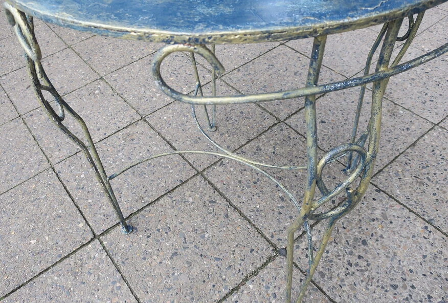 Inhabituel jardin en fer peint du milieu du siècle ou table de patio avec des couches de peinture.