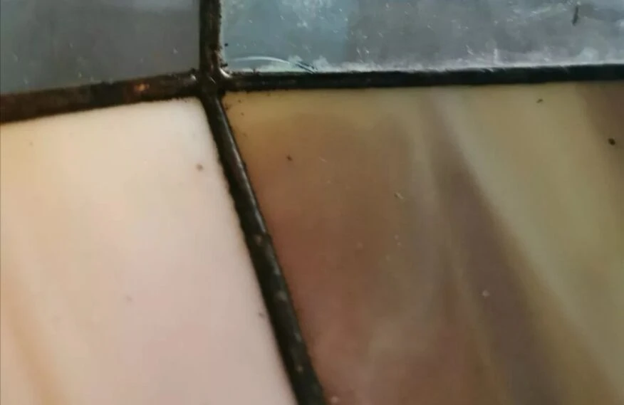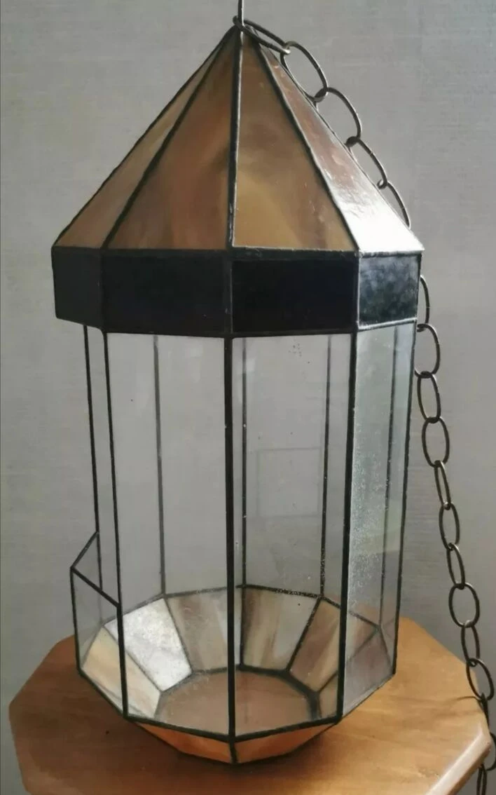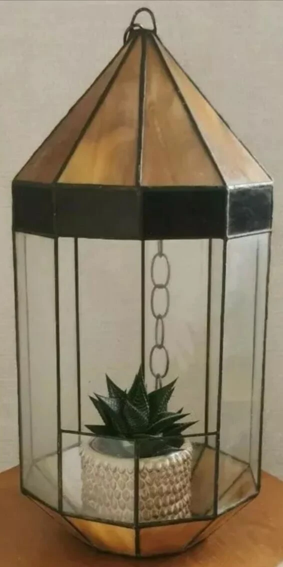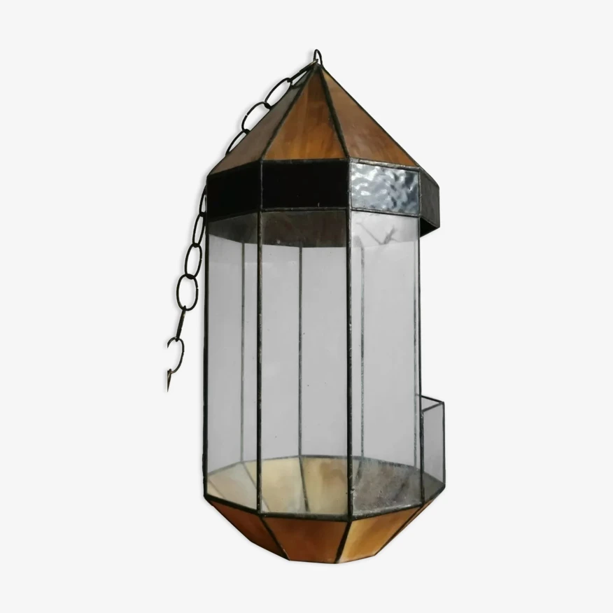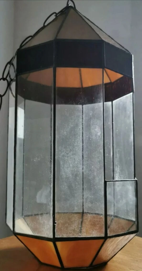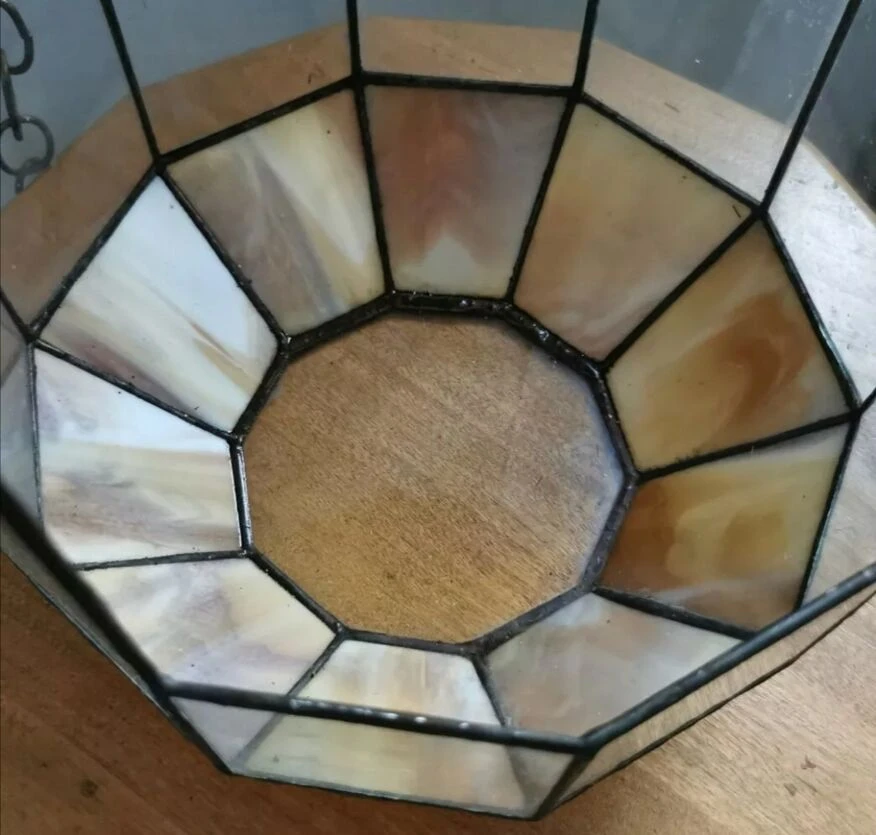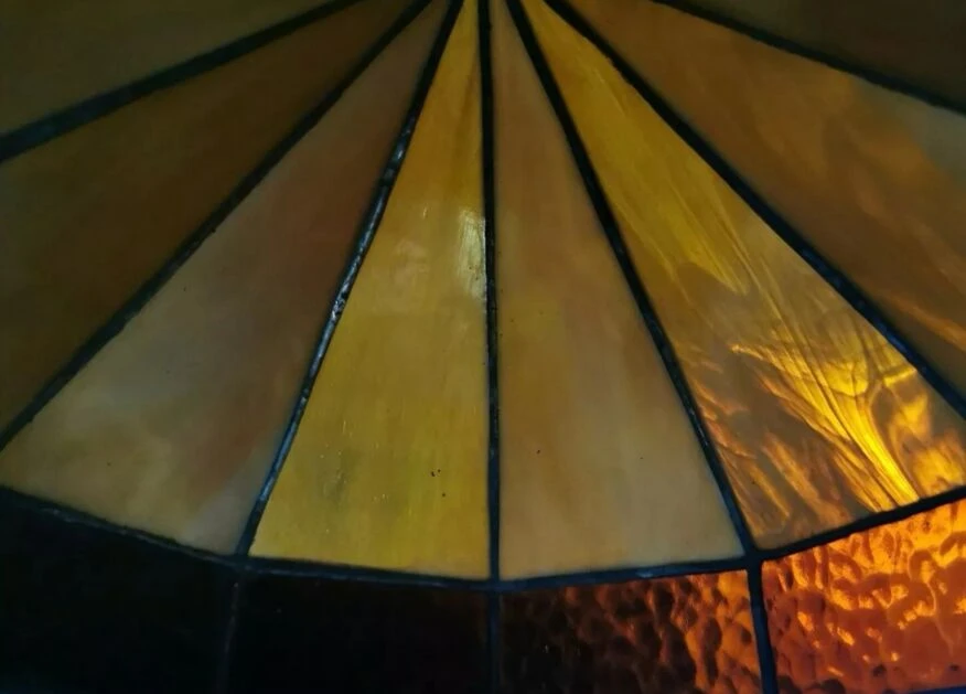 Pans de verre design tiffany avec nuances d’ambre et grenat avec contour en métal.