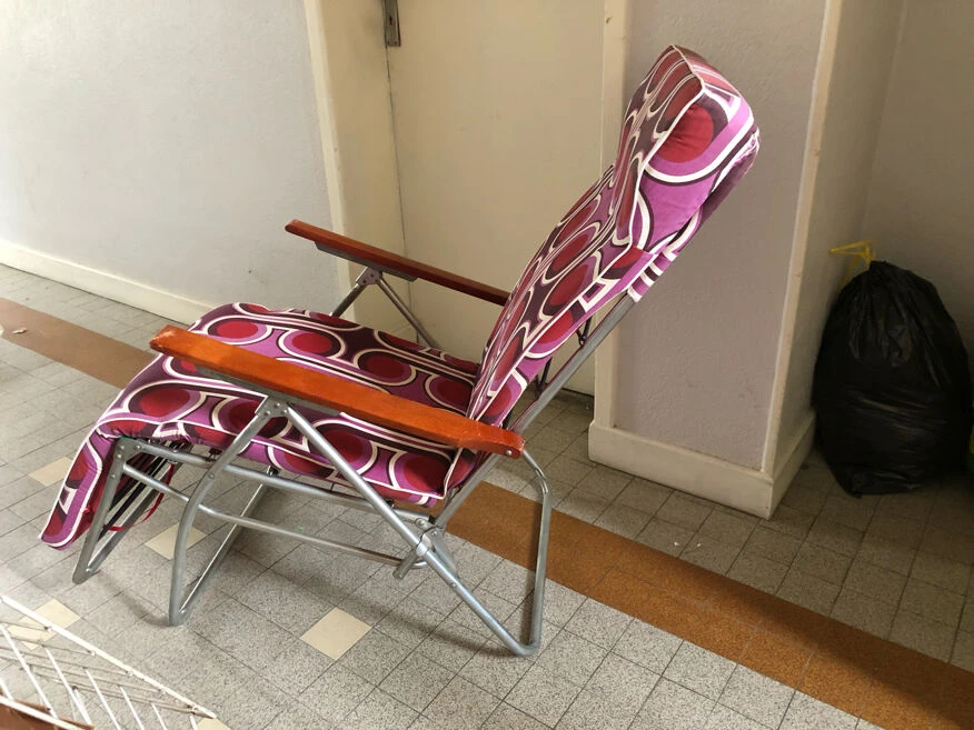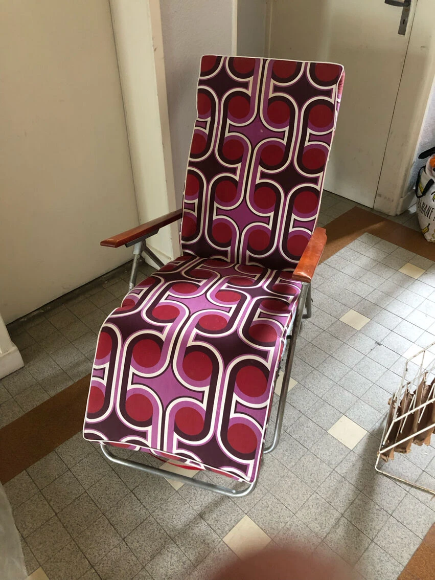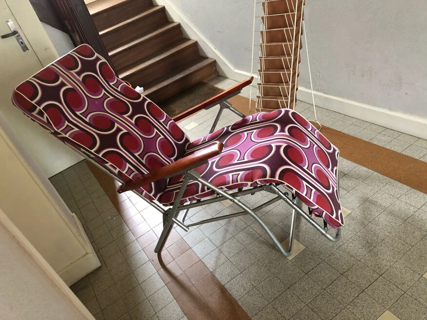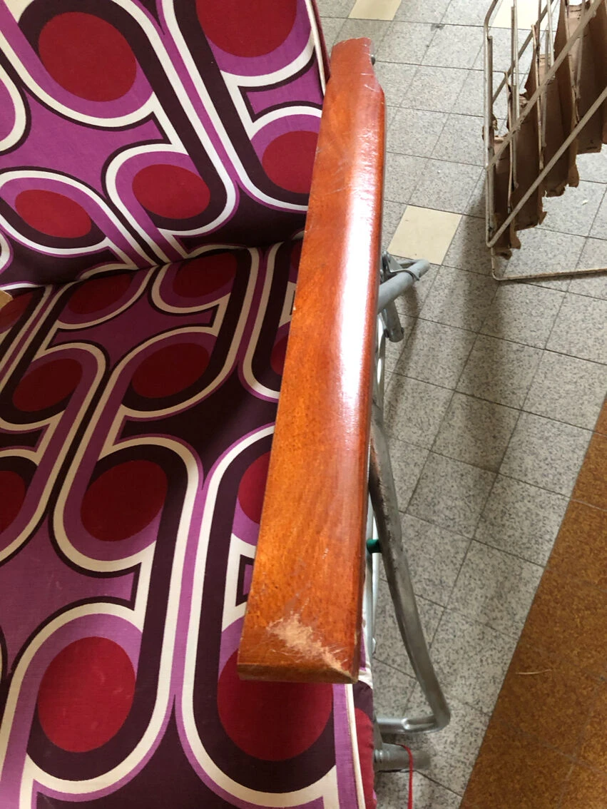 Les accotoirs en bois se soulèvent pour régler l’inclinaison du dossier.