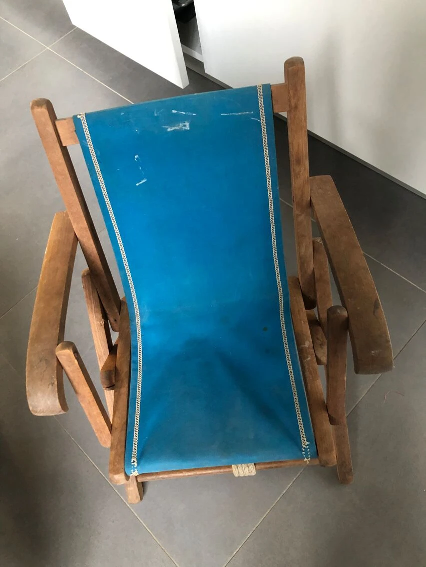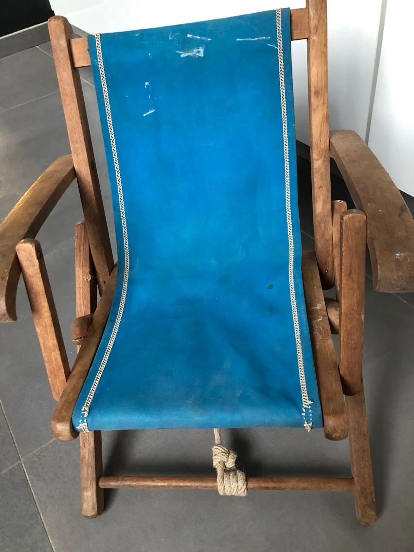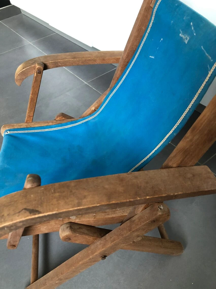 Petit transat ancien dans son jus à nettoyer.toile bleue solide.