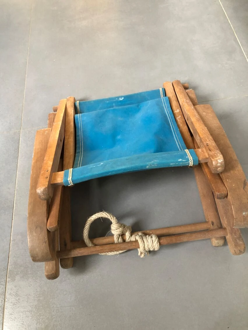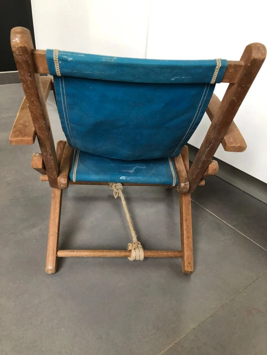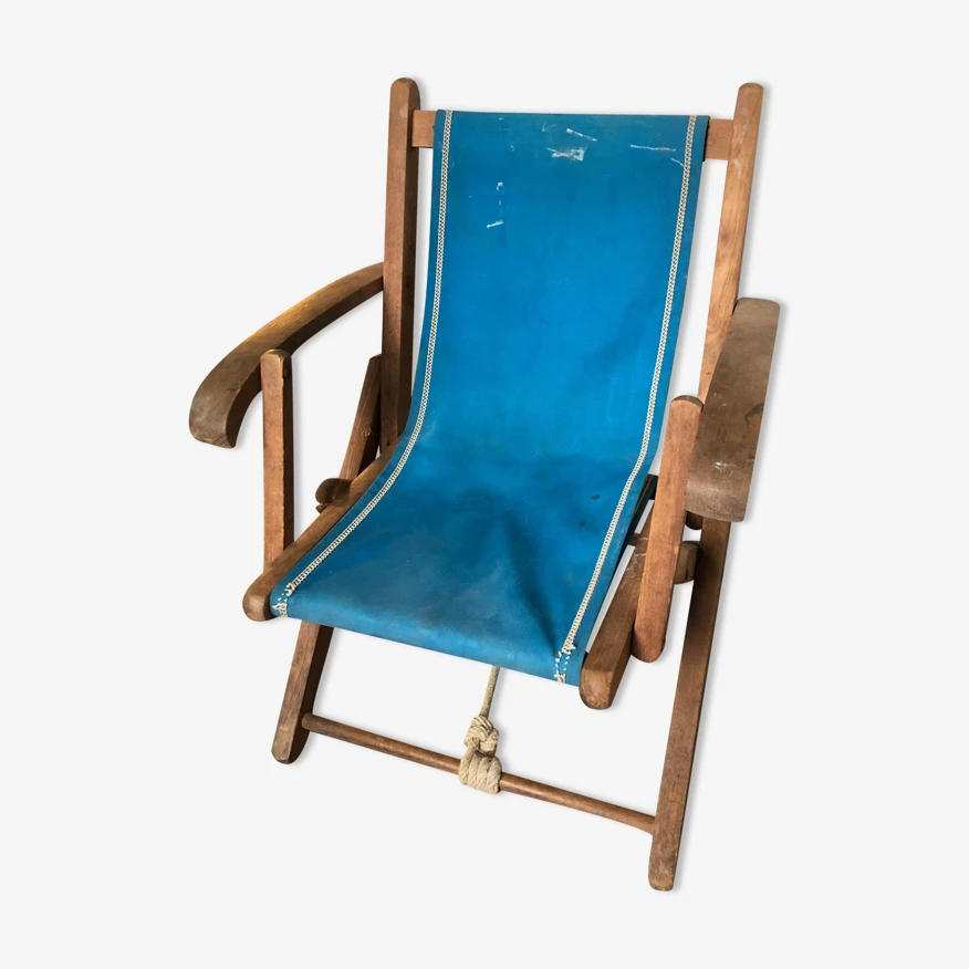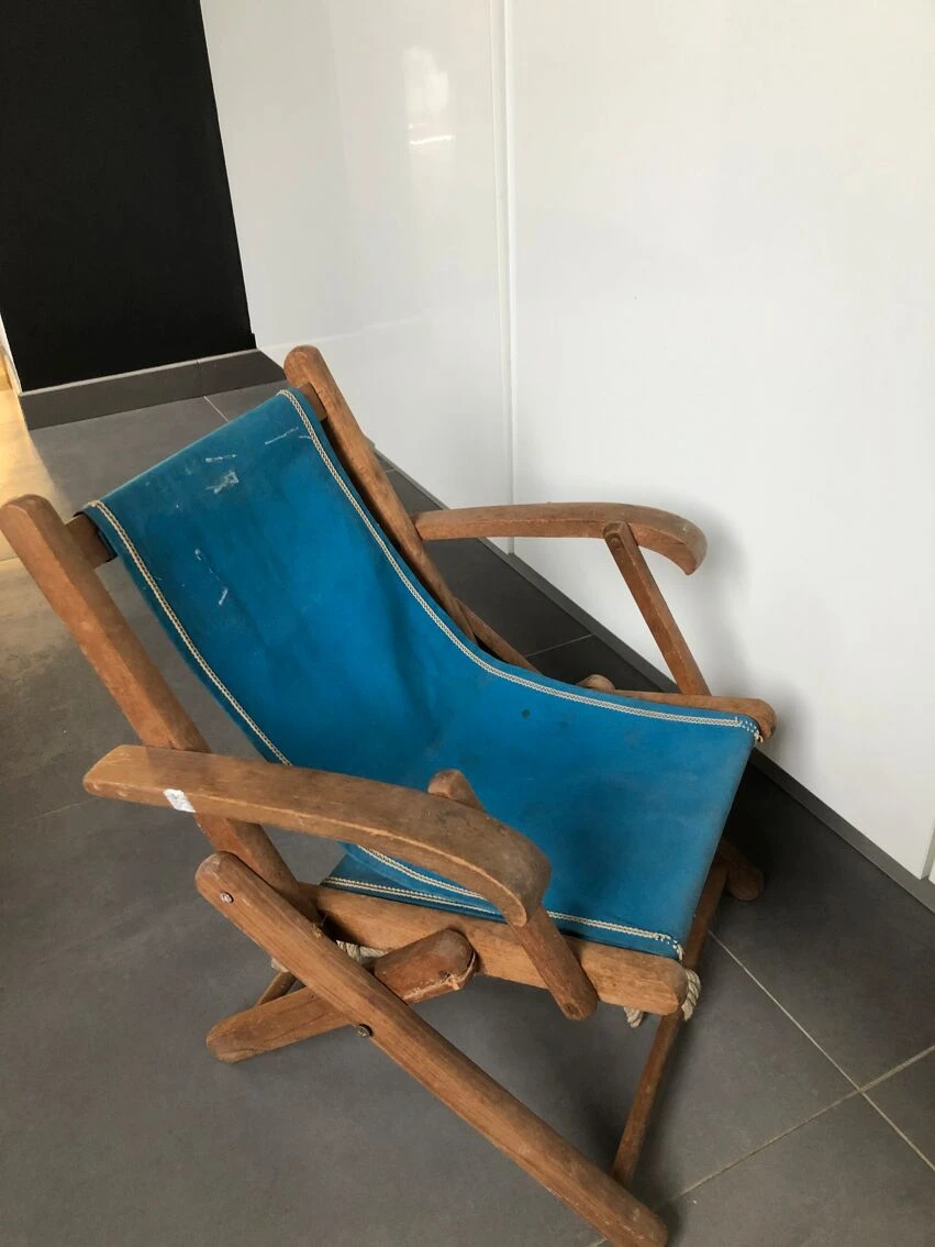 Petit transat ancien dans son jus à nettoyer.toile bleue solide.