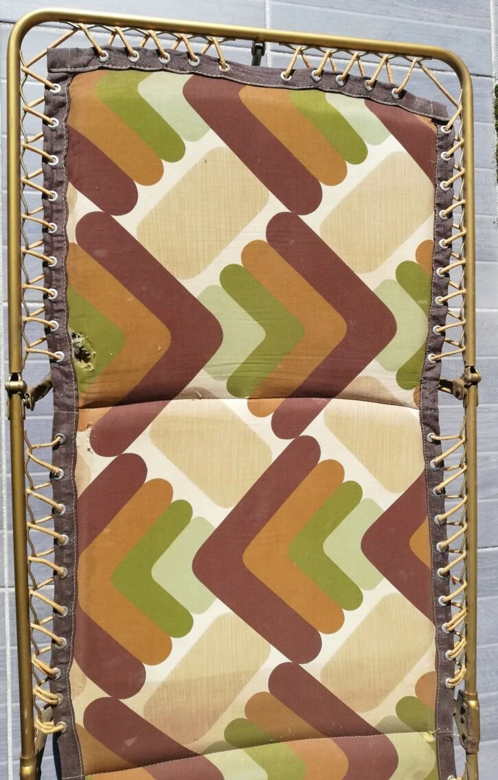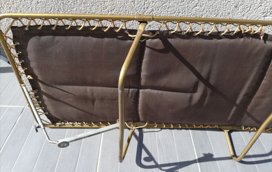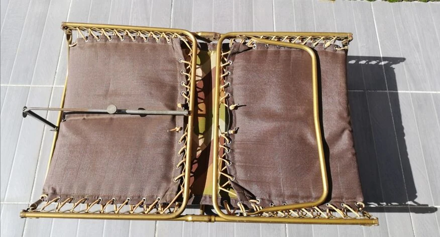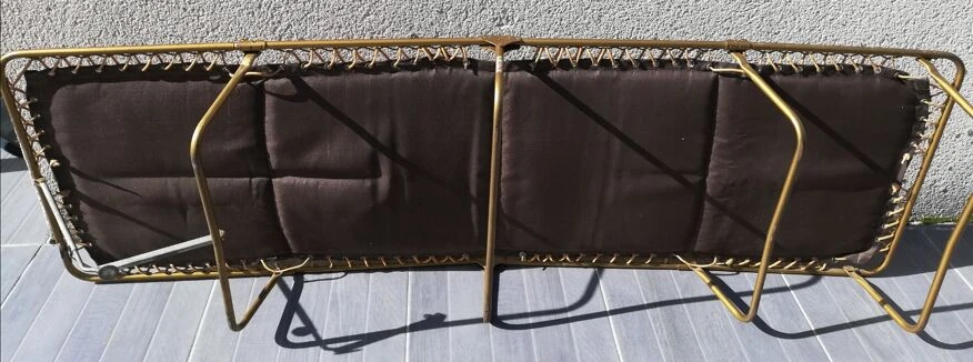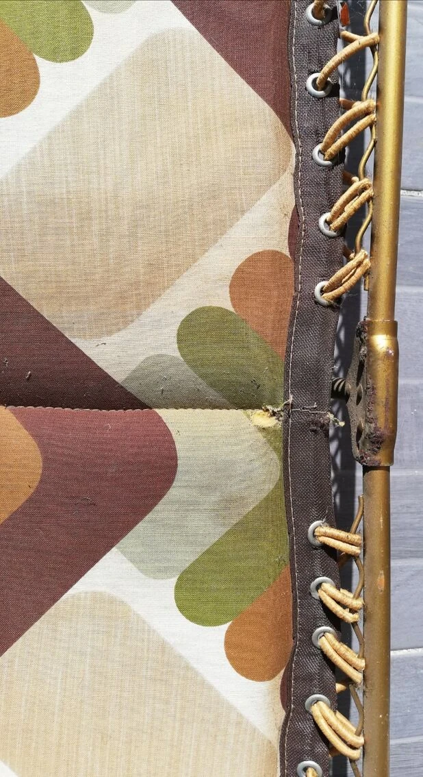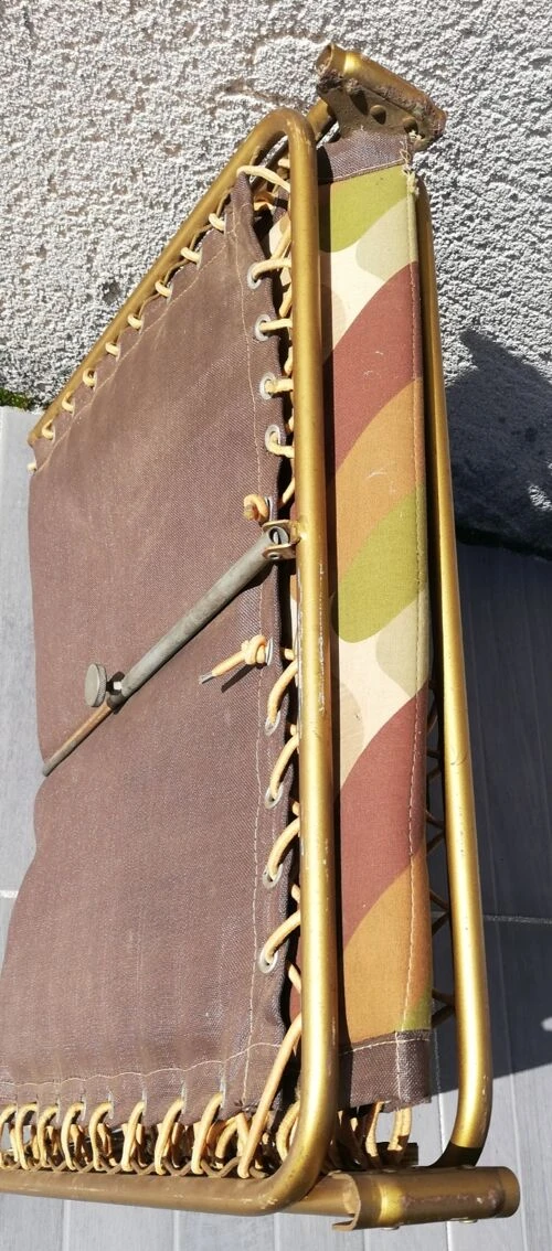 Pieds laiton, sandow solide pour tenir la toile matelassée, les couleurs toujours lumineuses et pour cause, il a passé plus de temps replié que dans le jardin ou en camping !